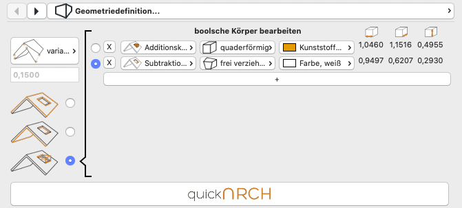 - Whether cuboid bodies (whose corners can also be freely warped if desired) are to be subtracted from the roof or added to the roof as Boolean operators.