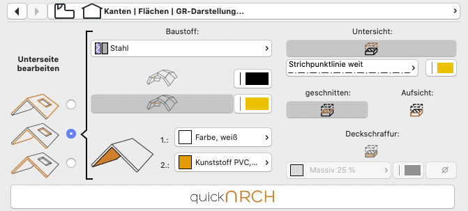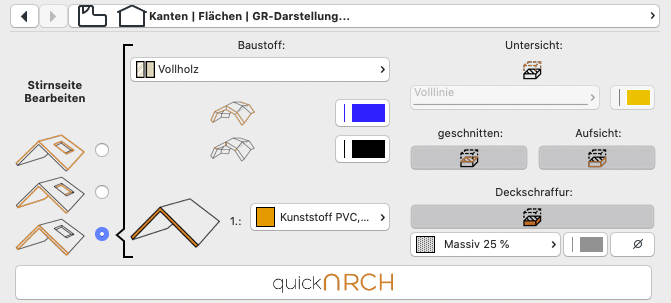 The quickArch Roof user interface is divided into two basic categories: the geometric properties of the object and their representation in ArchiCAD. The two categories are in turn sorted into the two roof sides and possible Boolean operators or the front side.