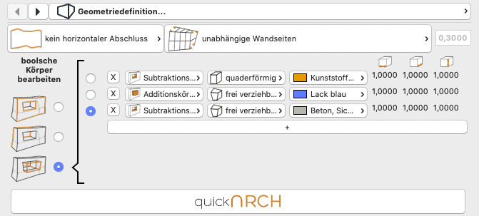 - Whether cuboid bodies (whose corners can also be freely warped if desired) are to be subtracted from the wall or added to the wall as Boolean operators.
