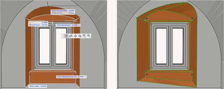 If a wall niche with an arch with or without a radiator niche and possibly a different depth in the lintel area for any ArchiCAD window is needed, the quickArch Bay offers a simple way to realise this by copying the existing ArchiCAD window, transferring the parameters from the copy to the quickArch Bay using the syringe in the settings window and then moving the niche and arch points in the floor plan and in the 3D window to the desired position.