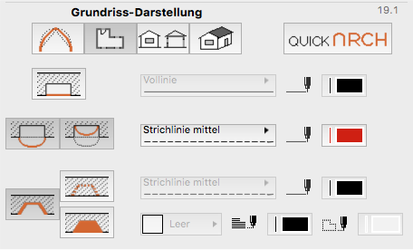 - How the reveal shape should be displayed (as a section, only the opening / niche contour or with additional cover hatching) as well as its line type, pen and, in the case of the latter, hatching type and foreground and background pen.